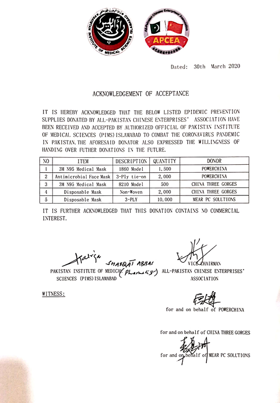 3月30日,在新冠肺炎疫情在巴基斯坦確診病例持續(xù)上升,疫情擴(kuò)散形勢(shì)愈發(fā)嚴(yán)峻的背景下,中國(guó)電建聯(lián)合5家在巴中資企業(yè),向巴基斯坦醫(yī)學(xué)科學(xué)研究院(PIMS醫(yī)院)和國(guó)家災(zāi)難管理局緊急捐助一批防疫物資及抗疫資金416萬(wàn)盧比。中國(guó)駐巴基斯坦大使館公使銜參贊王志華出席捐贈(zèng)活動(dòng),中國(guó)國(guó)際廣播電臺(tái)烏爾都語(yǔ)頻道FM98、Pakistan Today等媒體對(duì)活動(dòng)進(jìn)行采訪和報(bào)道。
