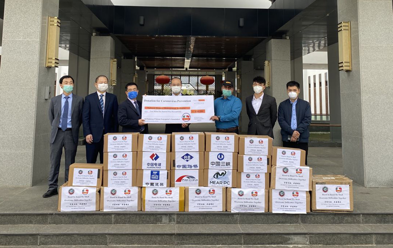 中國(guó)電建作為新當(dāng)選的全巴中資企業(yè)協(xié)會(huì)會(huì)長(zhǎng)單位,新冠肺炎疫情發(fā)生后,在中國(guó)駐巴基斯坦大使館指導(dǎo)下積極開(kāi)展聯(lián)防聯(lián)控信息報(bào)送及抗疫知識(shí)視頻培訓(xùn)活動(dòng),發(fā)出倡議組織駐巴企業(yè)在做好疫情防控工作的同時(shí)積極開(kāi)展捐贈(zèng)活動(dòng),展現(xiàn)中巴全天候戰(zhàn)略合作伙伴關(guān)系的特殊情誼。巴基斯坦代表處積極行動(dòng),號(hào)召電建駐巴各機(jī)構(gòu)及項(xiàng)目舉行捐贈(zèng)支援巴方,在巴集團(tuán)所屬機(jī)構(gòu)及項(xiàng)目部紛紛響應(yīng),自發(fā)組織員工捐款捐資,各單位員工積極參與奉獻(xiàn)愛(ài)心,短短一周時(shí)間即籌集了116萬(wàn)盧比現(xiàn)金(約合人民幣52,489元)及2000個(gè)一次性口罩,連同代表處專門(mén)采購(gòu)的1500個(gè)N95口罩一并通過(guò)中資企業(yè)協(xié)會(huì)名義統(tǒng)一捐贈(zèng)給巴方用于抗擊疫情。