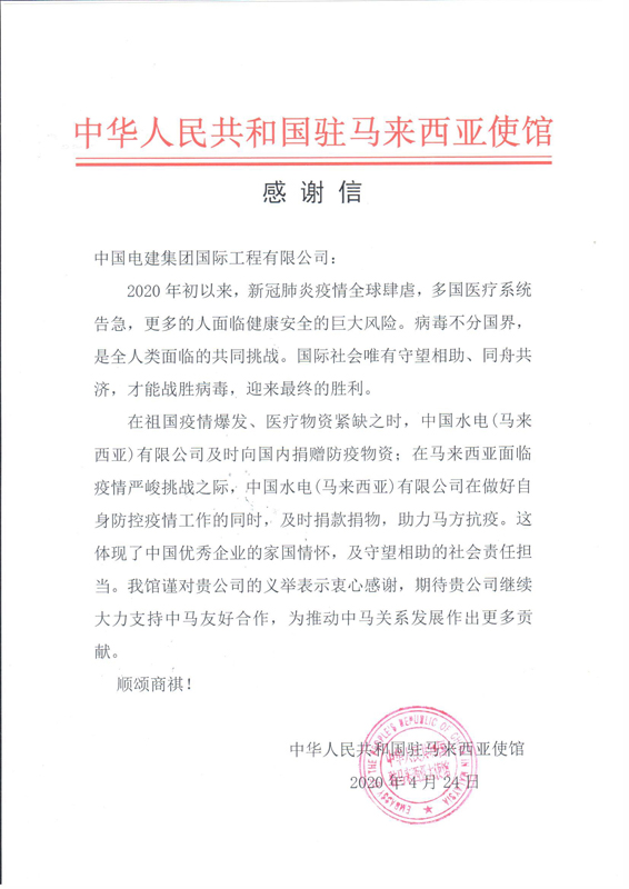 4月24日,中國(guó)駐馬來(lái)西亞使館向公司發(fā)來(lái)感謝信,對(duì)公司下屬中國(guó)水電(馬來(lái)西亞)有限公司(以下簡(jiǎn)稱馬公司)在祖國(guó)疫情暴發(fā)、醫(yī)療物資緊缺之時(shí)及時(shí)向國(guó)內(nèi)捐贈(zèng)物資,在馬來(lái)西亞疫情面臨嚴(yán)峻挑戰(zhàn)之際,做好自身防控的同時(shí)積極捐款捐物助力馬方抗疫給予了高度贊揚(yáng)。信中寫道:“這體現(xiàn)了中國(guó)優(yōu)秀企業(yè)的家國(guó)情懷,及守望相助的社會(huì)責(zé)任擔(dān)當(dāng)。”